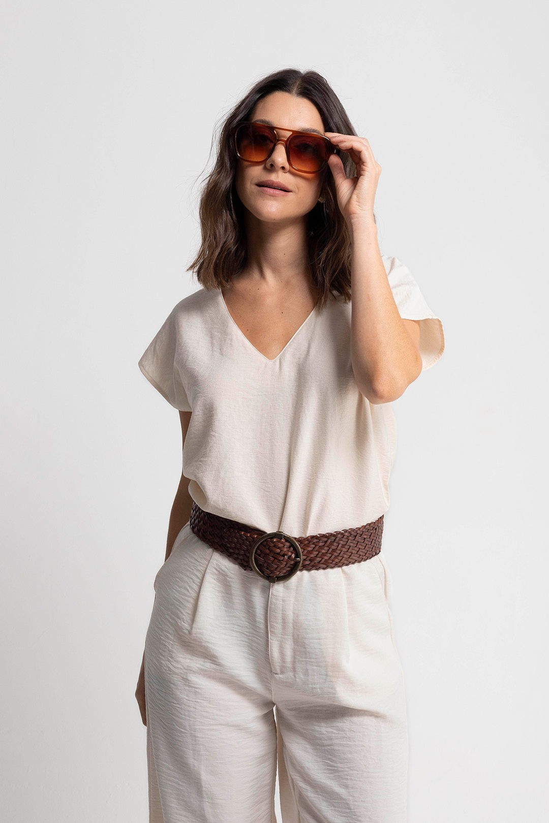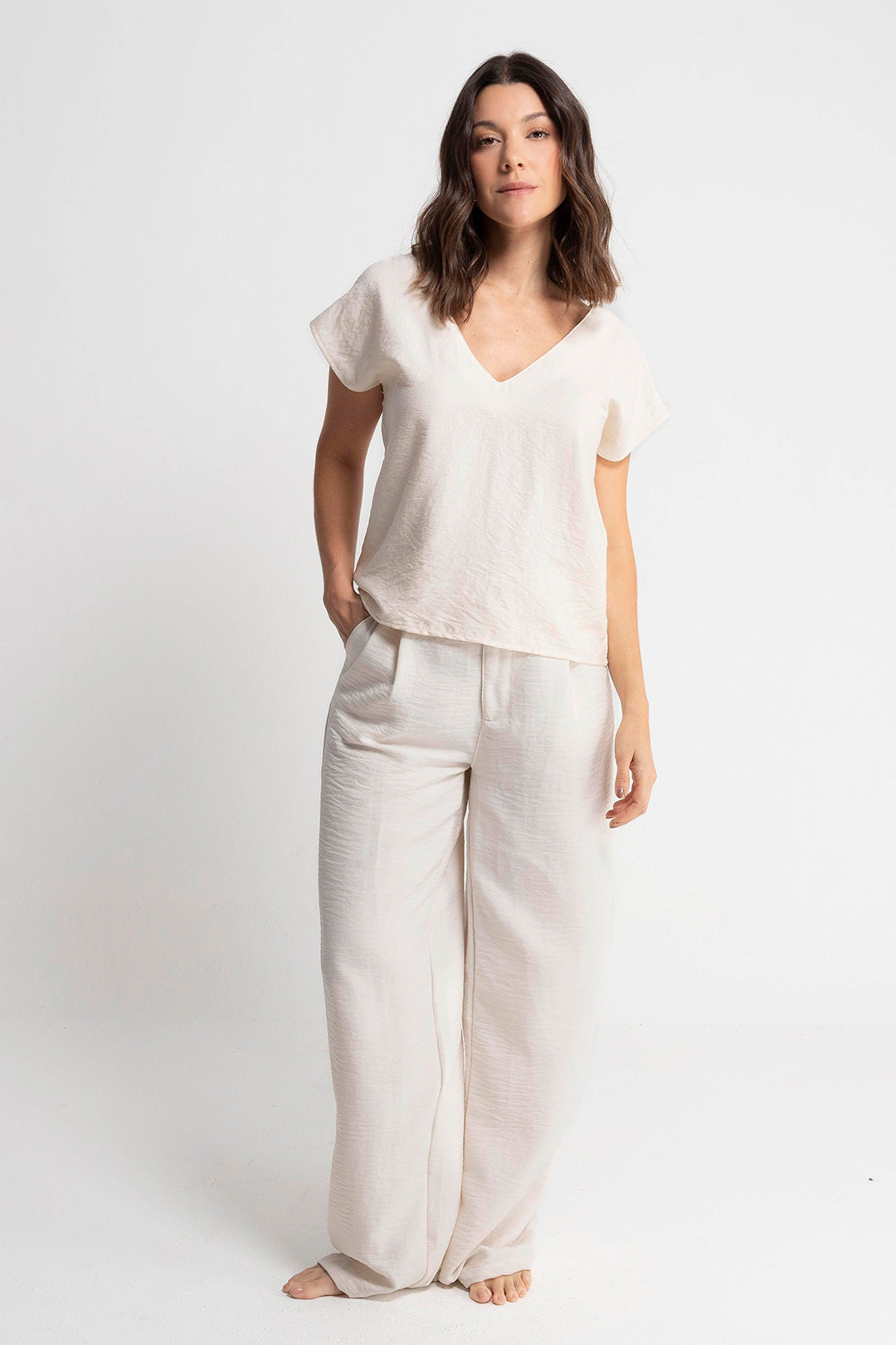 Nuestra camisa básica marfil para mujer, tienen una silueta amplia, confeccionada en rayón ligero que destaca por su frescura, caída natural y movimiento. Tiene escote en V al frente y en la espalda, que le da un toque sofisticado y diferente a un básico de todos los días.