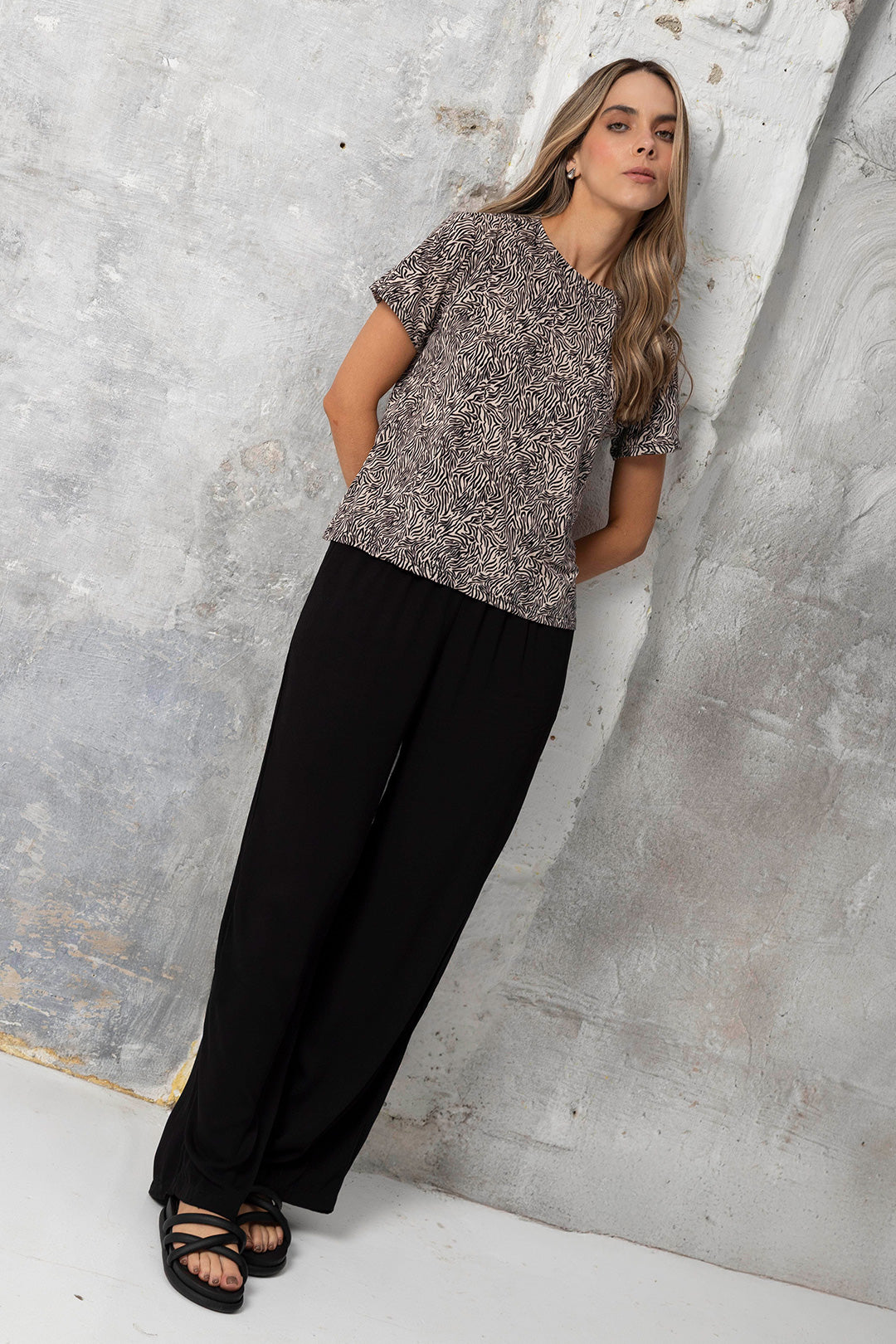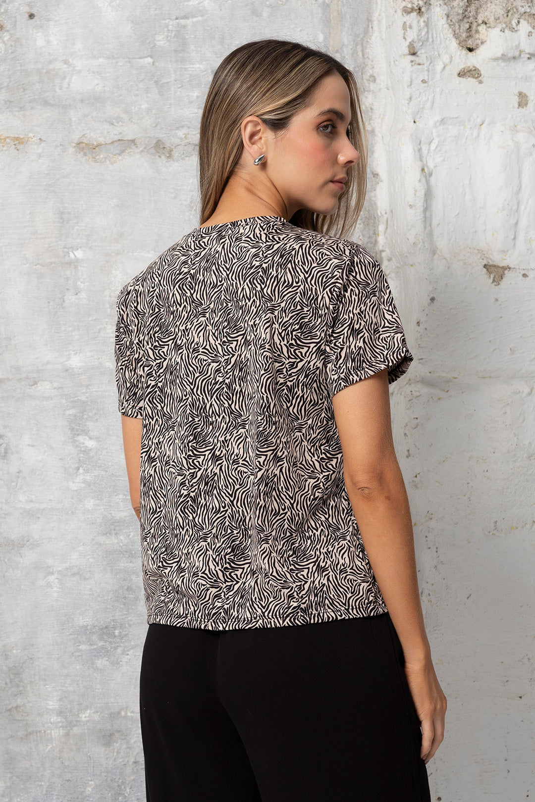 Silueta amplia con cuello redondo y manga corta. Confeccionada en una tela suave al tacto que aporta frescura y ligereza. Su estampado de cebra le da un aire relajado y atemporal. Una prenda versátil que se adapta a distintos estilos y ocasiones.