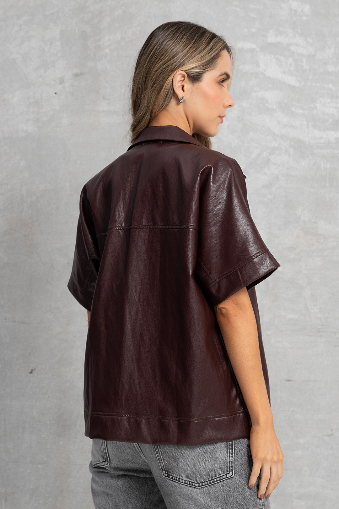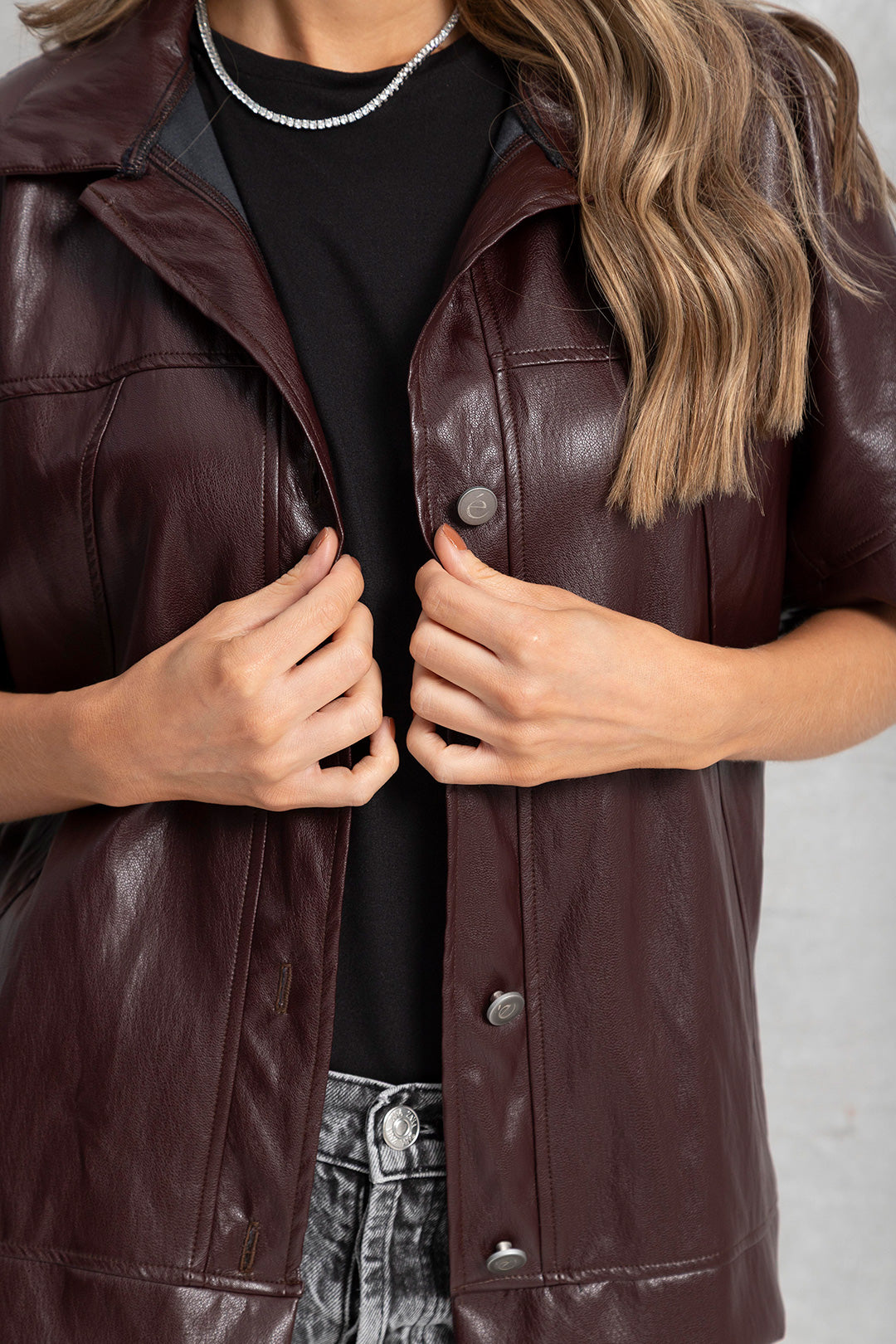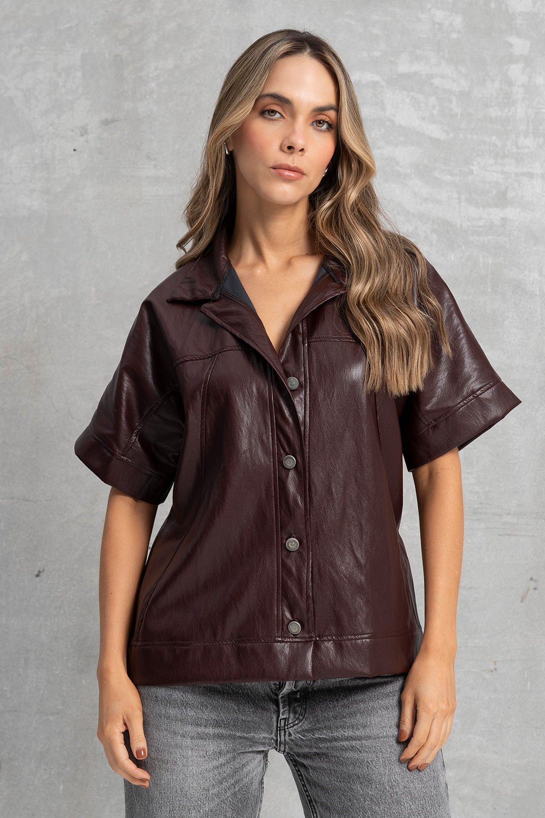 El Chaleco Atenea vino tinto con mangas cortas, cuello tipo camisa y botones. Se puede usar cerrado como protagonista del outfit, o abierto para un look más relajado y casual. Con textura suave y un acabado que imita el cuero con un brillo sutil. Es una prenda que se combina fácilmente con jeans, pantalones estampados o vestidos. Ideal para cualquier look casual o de fiesta.
